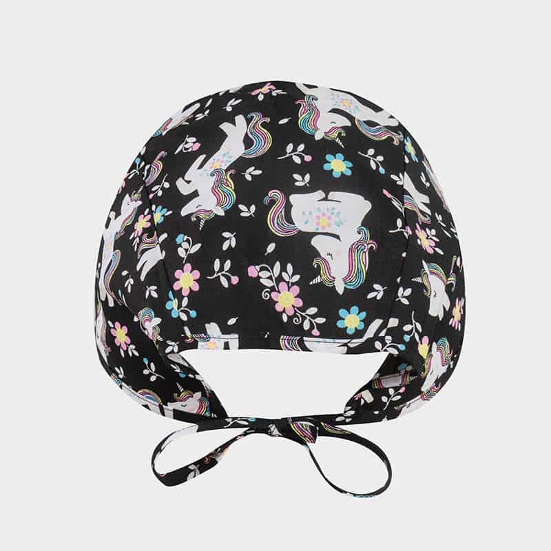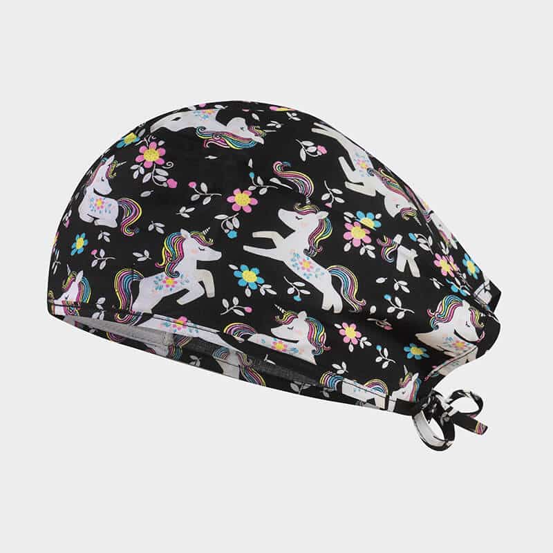 Surgical hat with cheerful print made from high quality fabric with elastane and 3D FLEX technology for improved comfort. Тowel-lined forehead. Universal size and tying with strings.