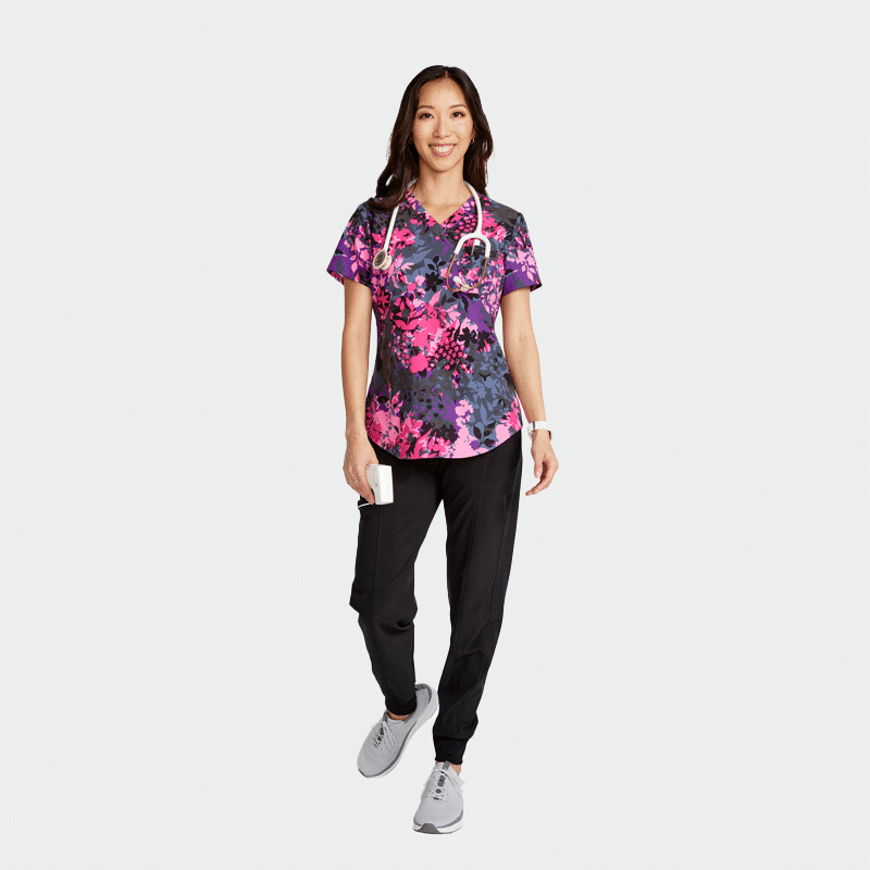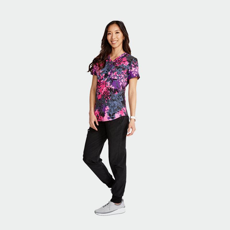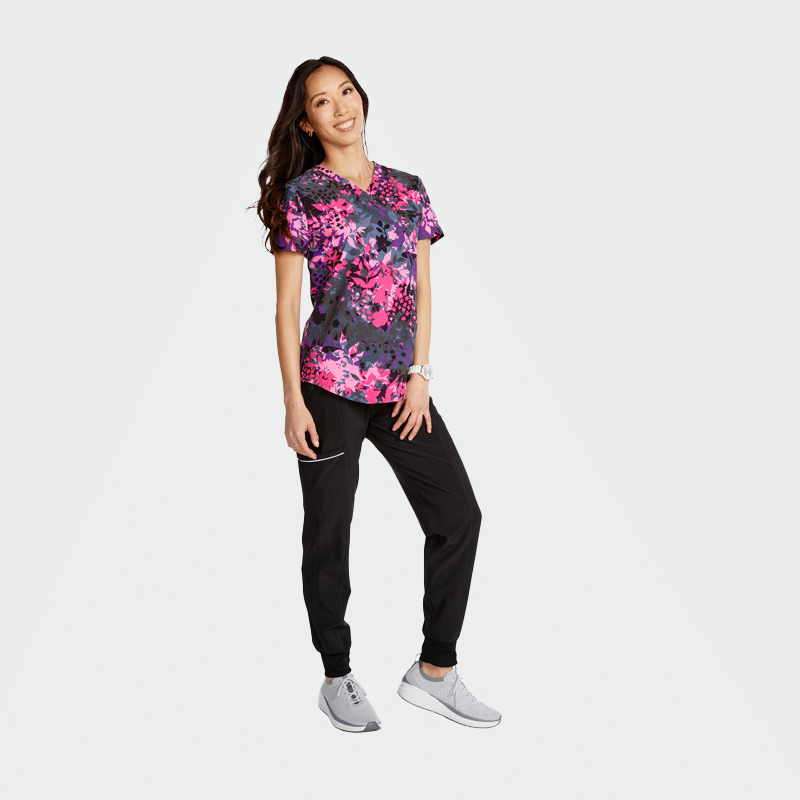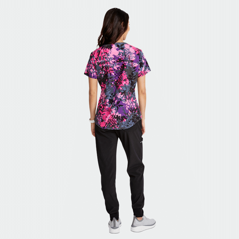 Scrub top GENUINE CK664 is an elegant CHEROKEE brand women’s tunic with a fitted silhouette, V-neckline and modern color print. It is made of 52% recycled polyester, 40% polyester and 8% elastane with a density of 175g/m².
