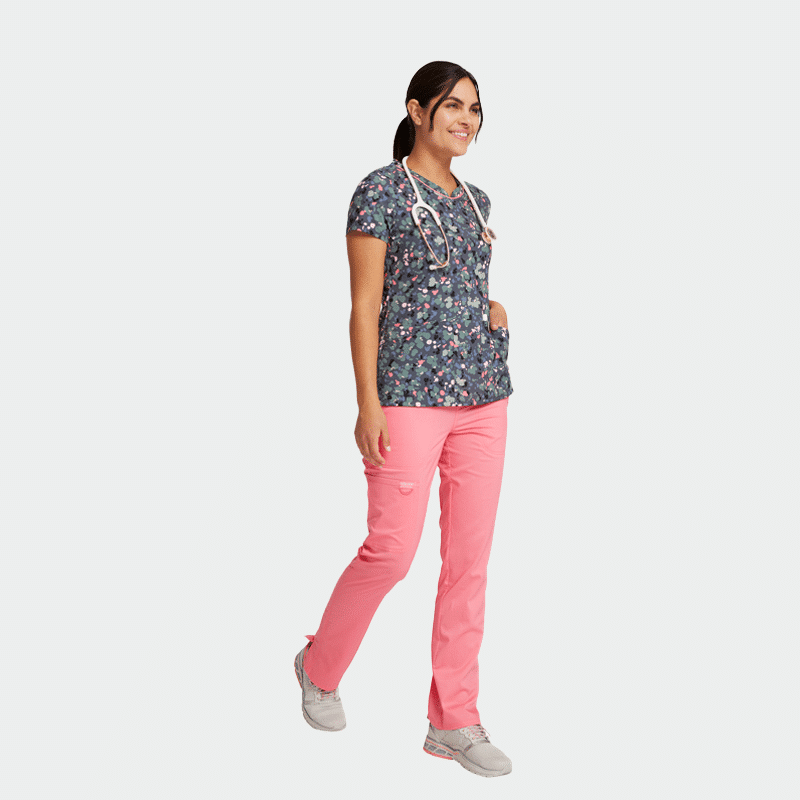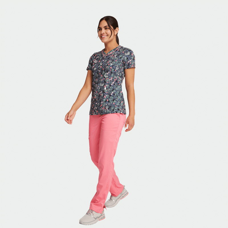 GENUINE Scrub top CK678 is an elegant CHEROKEE brand women’s scrub top with a fitted silhouette, V-neck and modern color print. It is made of 52% recycled polyester, 40% polyester and 8% elastane with a density of 175g/m².