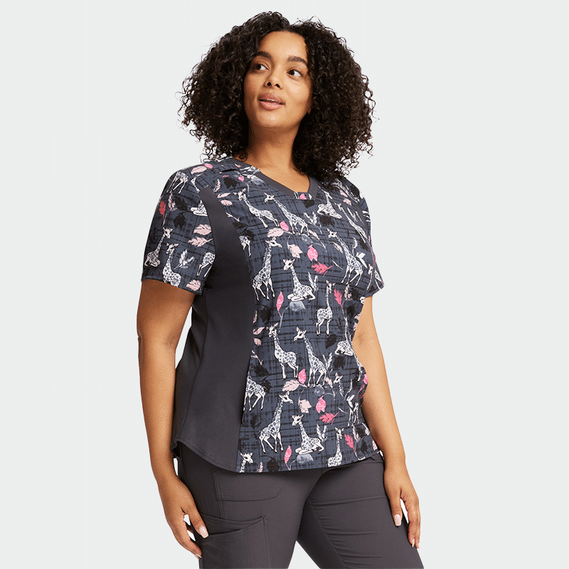 Scrub top IFLEX CK641 is an elegant CHEROKEE brand women’s tunic with a fitted silhouette, a V-neckline and a trendy giraffe-animated floral print. It is made of 93% polyester and 7% elastane with a density of 175g/m².
