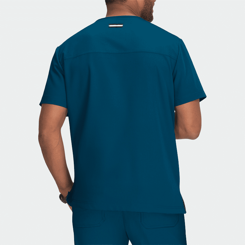 The NEXT GEN 672 medical scrub top by KOI is a men’s tunic made from lightweight fabric, composed of polyester, viscose, and elastane.