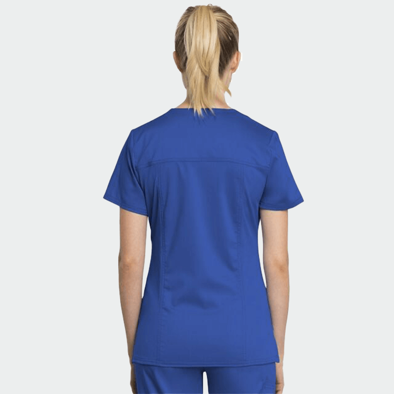 The REVOLUTION WWE775AB medical top is an elegant women’s scrub top by CHEROKEE, featuring short sleeves and a V-neckline. It is made of 78% polyester, 20% viscose, and 2% elastane with a fabric weight of 120 g/m².
