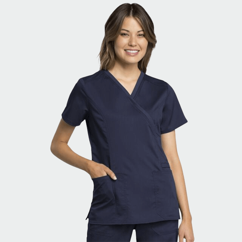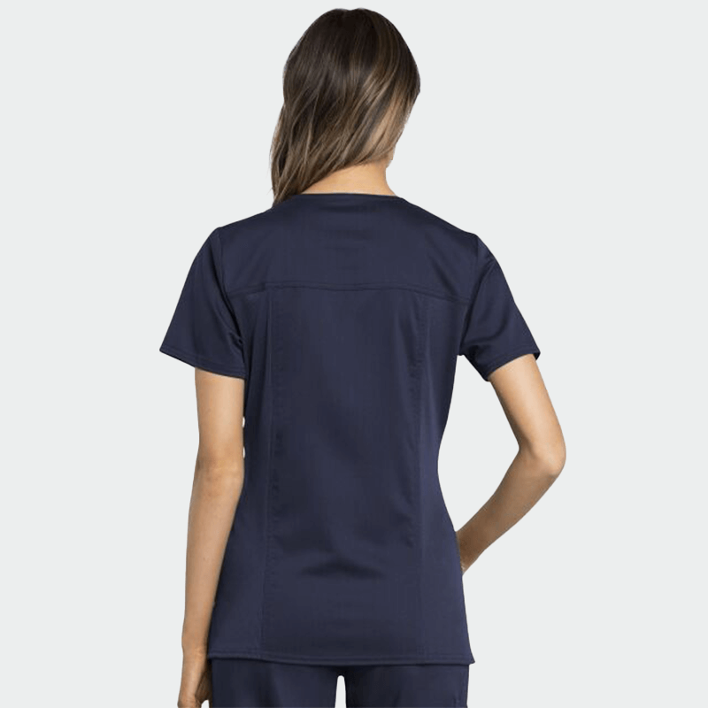 The REVOLUTION WWE775AB medical top is an elegant women’s scrub top by CHEROKEE, featuring short sleeves and a V-neckline. It is made of 78% polyester, 20% viscose, and 2% elastane with a fabric weight of 120 g/m².