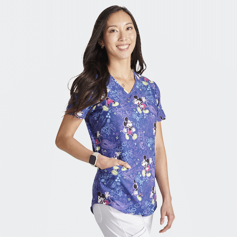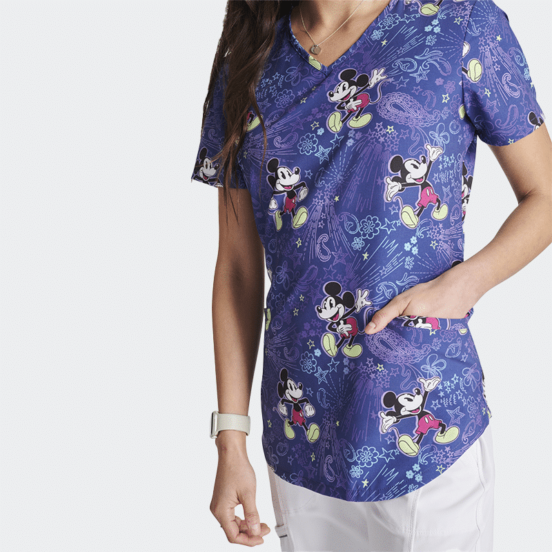 Scrub top TOONIFORMS-DISNEY TF737 is an elegant CHEROKEE brand women’s tunic with a fitted silhouette, V-neckline and trendy colorful Mickey Mouse print. It is made of 93% polyester and 7% elastane with a density of 175g/m².