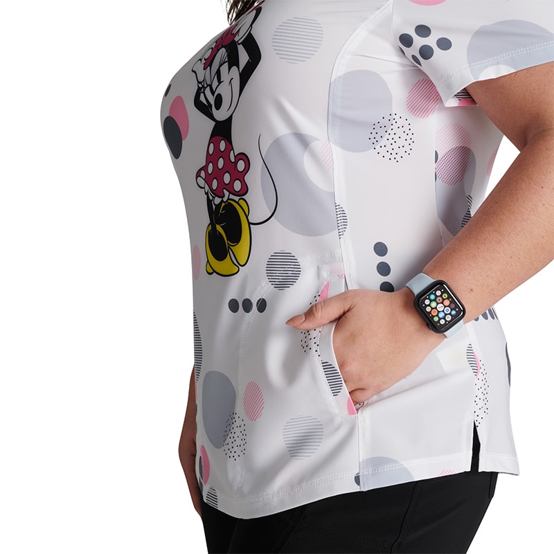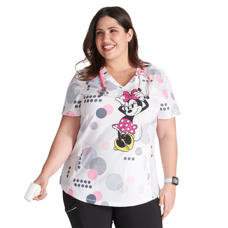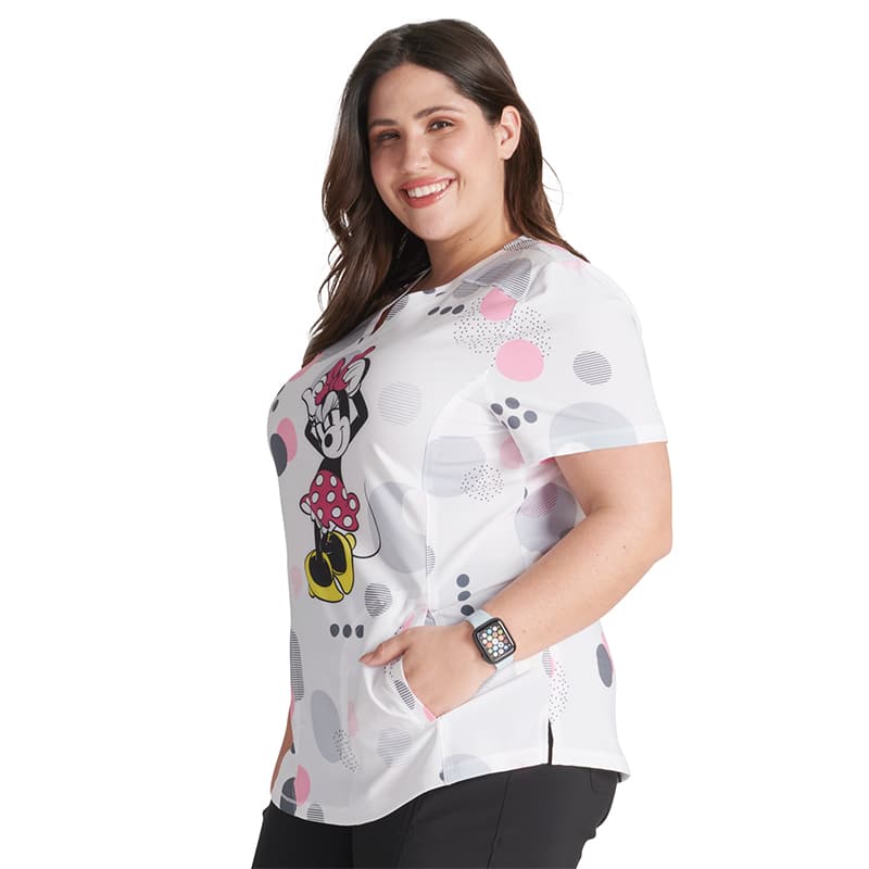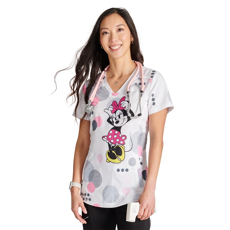 Scrub top TOONIFORMS-DISNEY TF752 is an elegant CHEROKEE brand modern women’s tunic with a fitted silhouette, V-neckline and trendy colorful Minnie Mouse print. It is made of 93% polyester and 7% elastane with a density of 175g/m².