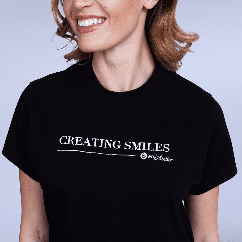 The women’s Creating Smiles T-shirt from our luxurious Bwell Atelier collection is made of 100% soft and breathable cotton, with “Creating Smiles” embroidery that ensures exceptional all-day comfort.