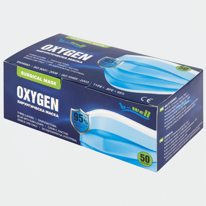 Μάσκα προσώπου μιας χρήσης OXYGEN, 3 στρώσεων,χρώματος μπλε με λάστιχο και έλασμα μύτης. Πιστοποιημένη EN 14683:2005, Τύπος II, BFE >95%.