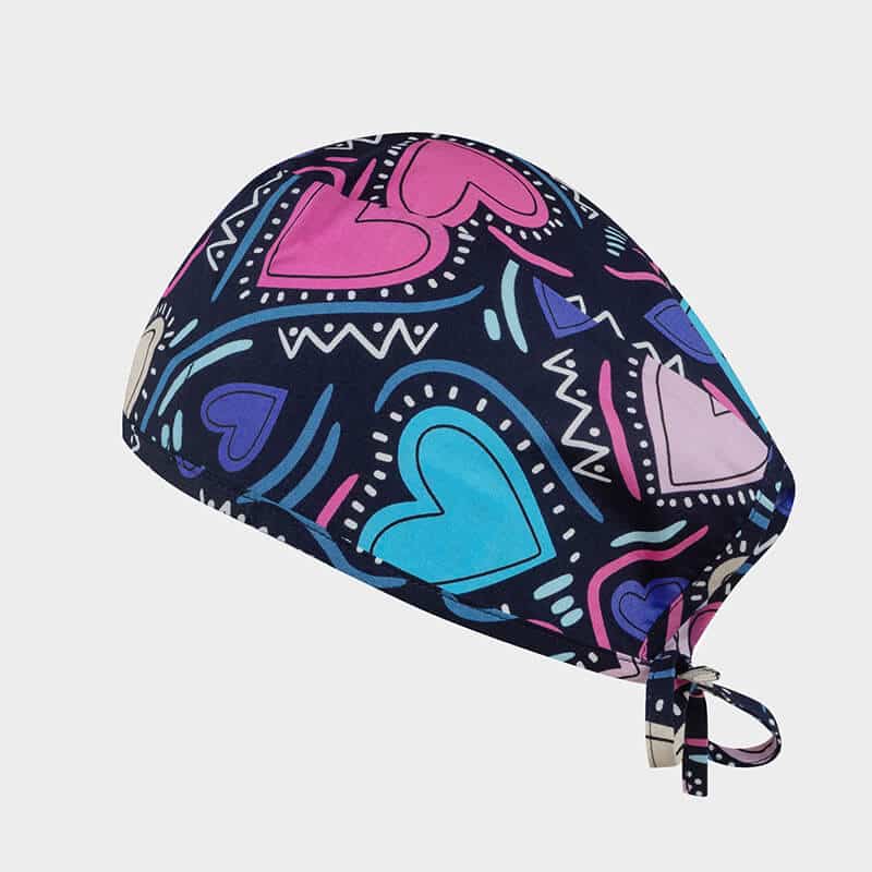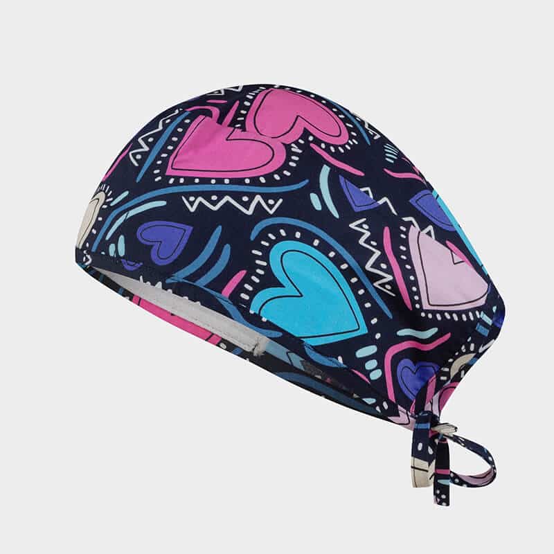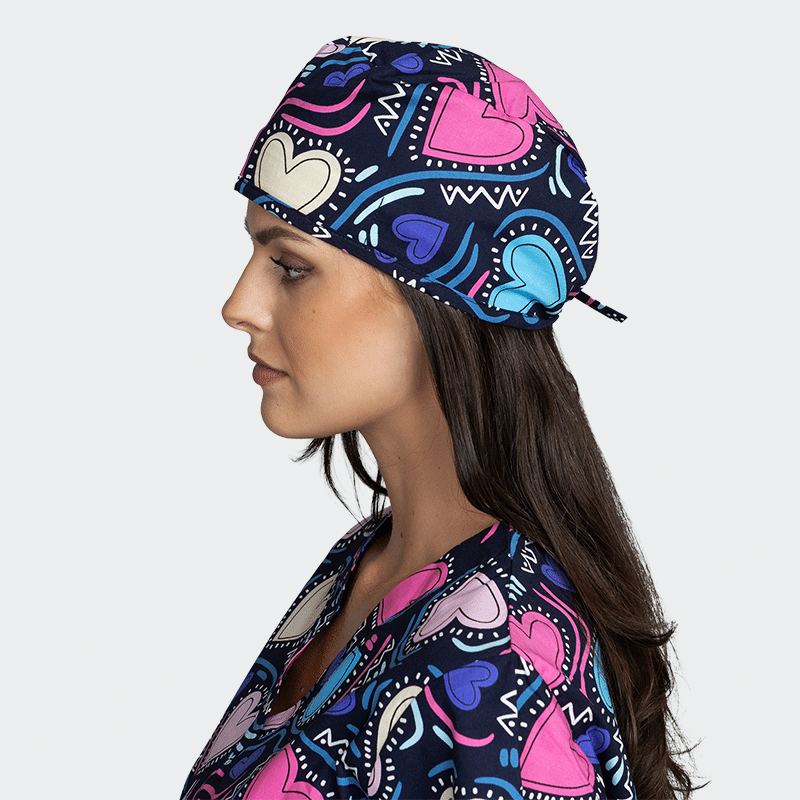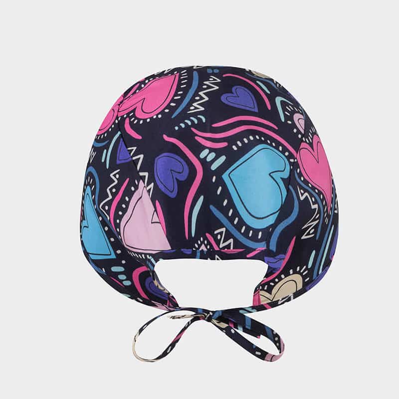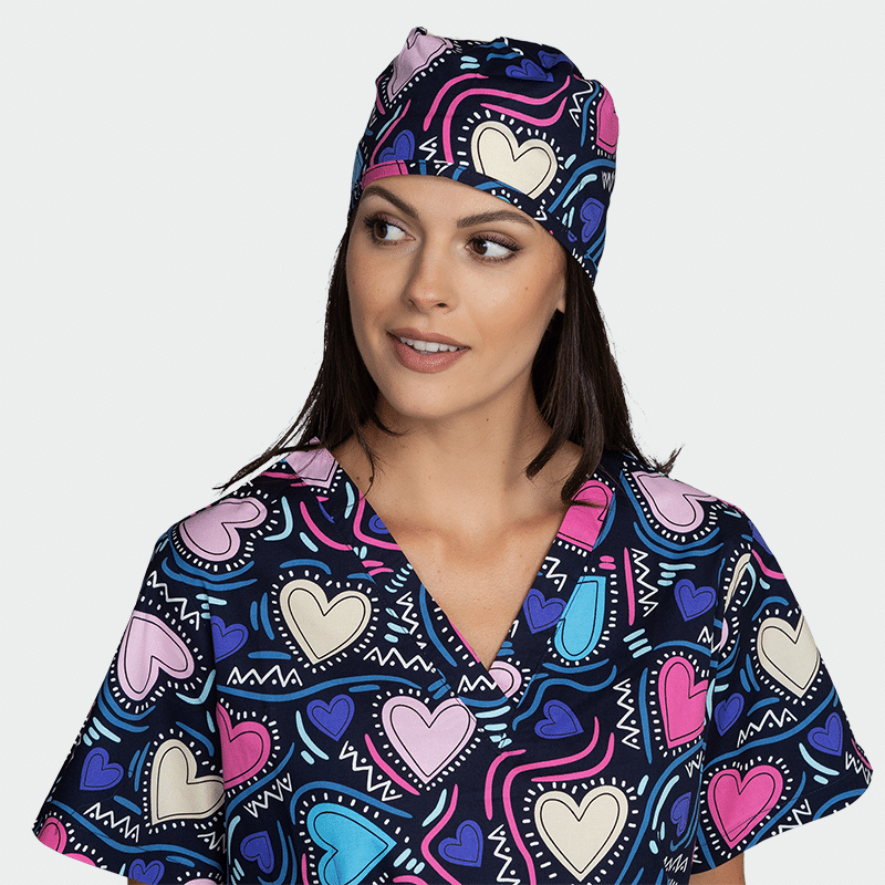 Surgical hat with cheerful print made from high quality fabric with elastane and 3D FLEX technology for improved comfort. Тowel-lined forehead. Universal size and tying with strings.