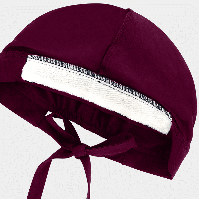 Σκουφάκι χειρουργείου Verona της B-well. Χρώμα Μπορντό, ρυθμιζόμενο με δέσιμο και πετσέτα στο μέτωπο. Unisex, σε πολλά χρώματα.