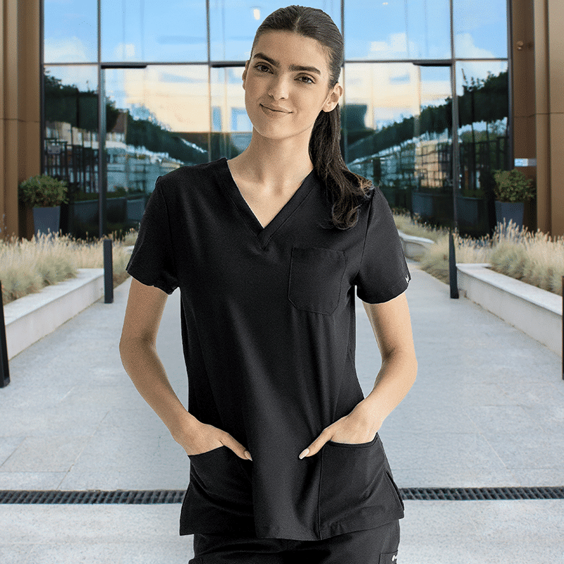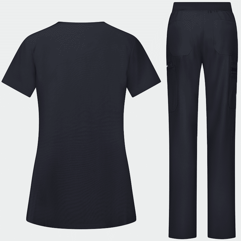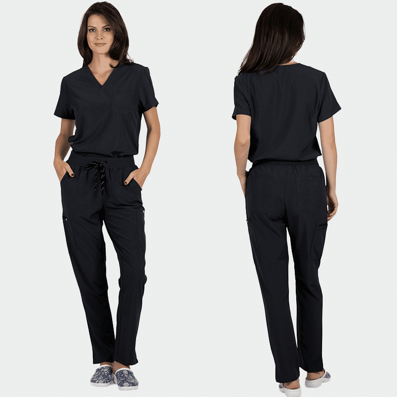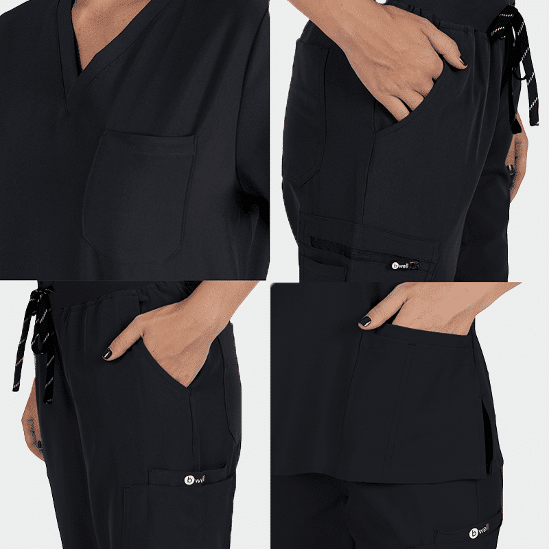 Γυναικείο ιατρικό σετ BELLA της B-well. Χρώμα Μαύρο. Αέρινο ύφασμα, V-λαιμόκοψη, λάστιχο και κορδόνι στη μέση, πολλές τσέπες.