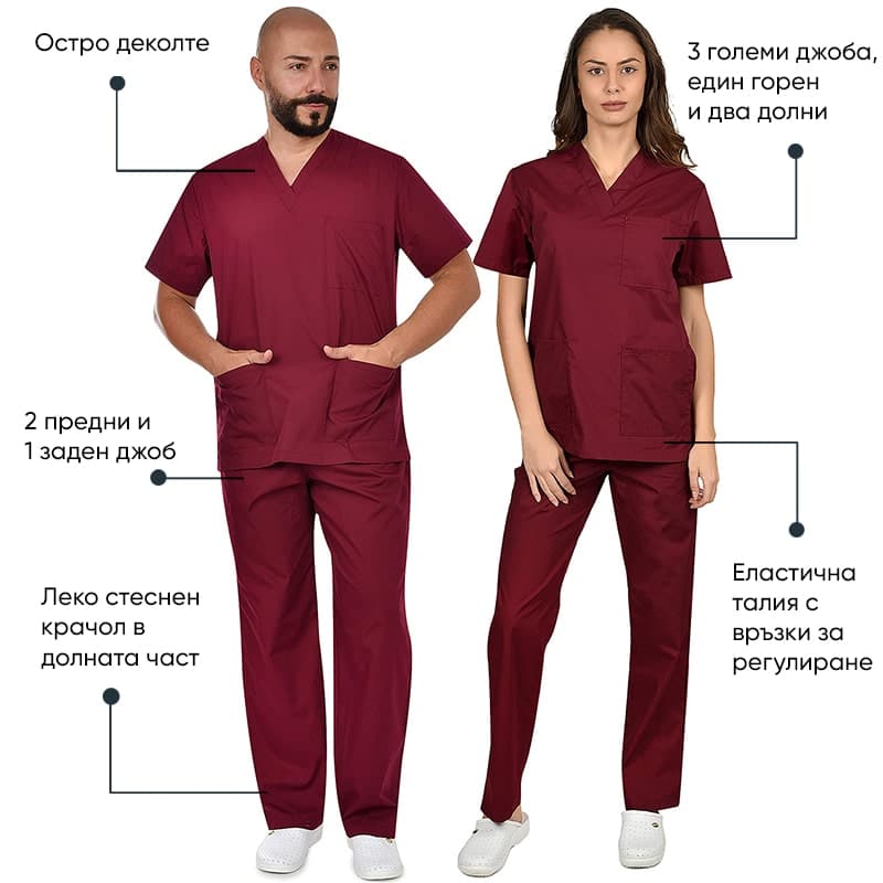 Unisex ιατρικό σετ CESARE της Bwell. Χρώμα Μπορντό. Διαθέσιμο σε 8 χρώματα, διαπνέον ύφασμα, άνεση και κομψότητα όλη μέρα.