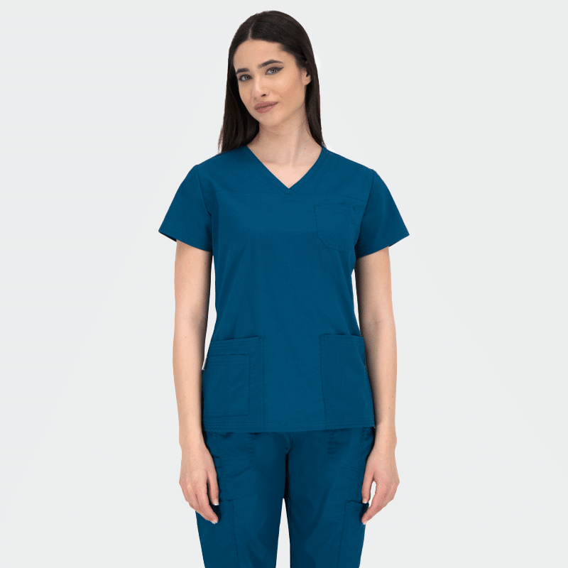 Ιατρική μπλούζα (Scrub top) ANDREA της B-well με 3D Flex και CL 40°C. Χρώμα Μπλε Καραϊβικής. V-λαιμόκοψη, 4 τσέπες, τριπλές ραφές. Premium εφαρμογή σε 8 χρώματα για χώρους υγείας.