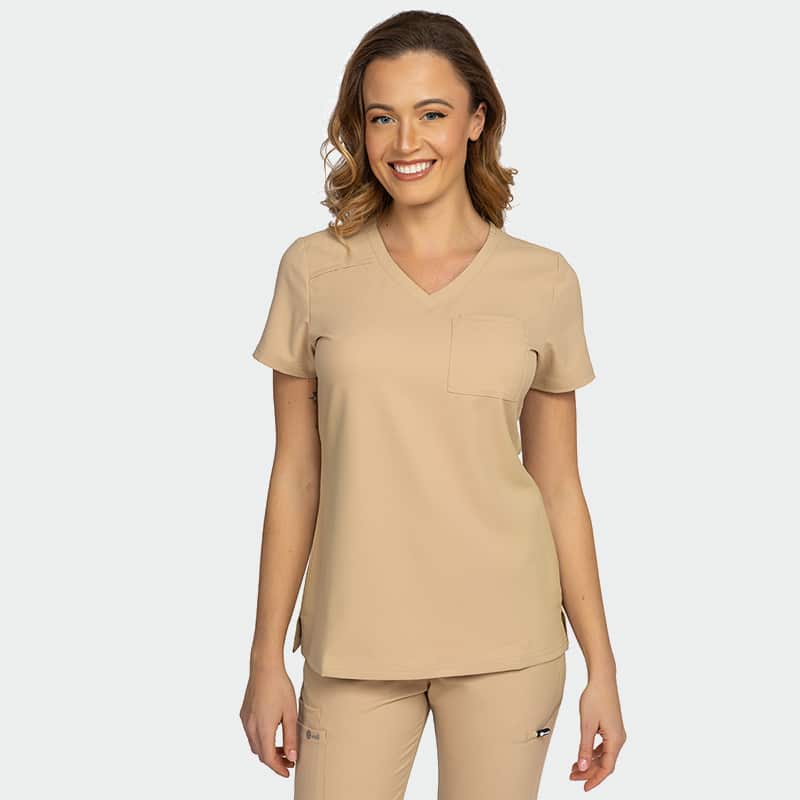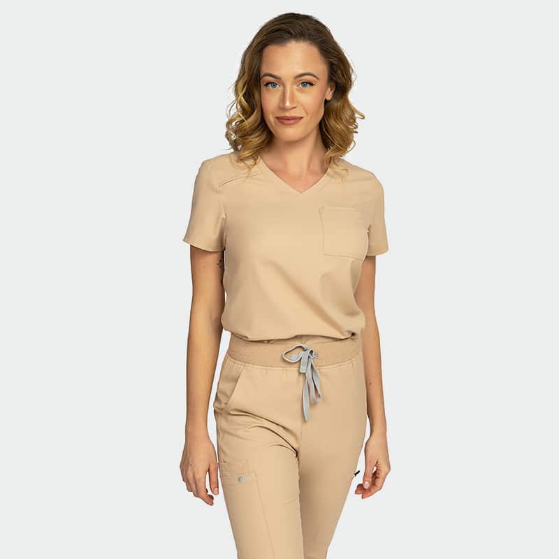 Γυναικεία Ιατρική μπλούζα (Scrub Top) AURELIA της B-well. Χρώμα Μπεζ σκούρο. Πολυεστέρας με τεχνολογίες Anti Wrinkle, Antimicrobial και Odor Resistant. V-λαιμόκοψη, διπλή τσέπη, θηλιά κάρτας.