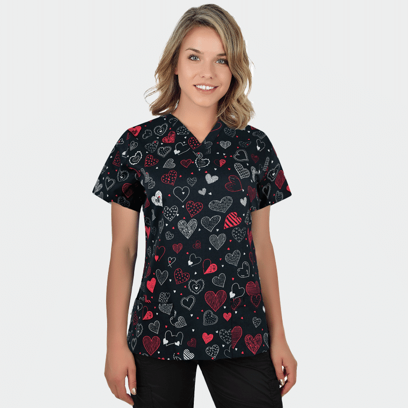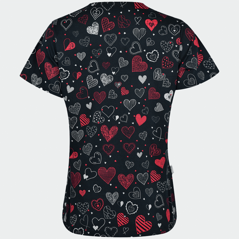 Ιατρική μπλούζα (Scrub top) BAMBINA της B-well με χαρούμενα σχέδια. Τύπωμα Dark Hearts. 3D Flex και CL 40°C τεχνολογία. Με 2 τσέπες και V-λαιμόκοψη. Ιδανική για παιδιατρικά & κτηνιατρικά κέντρα.