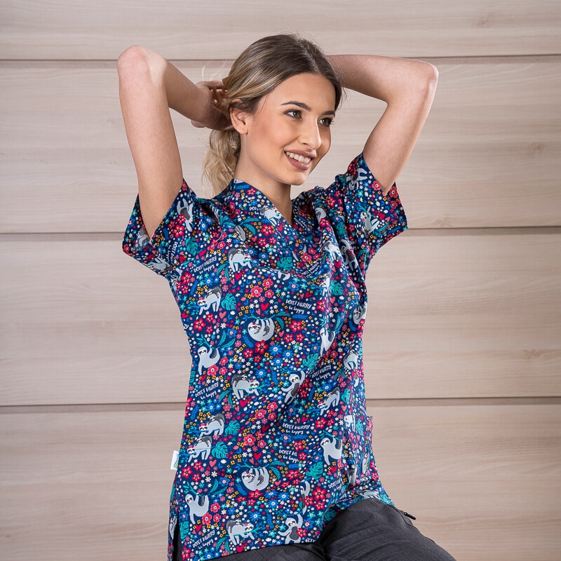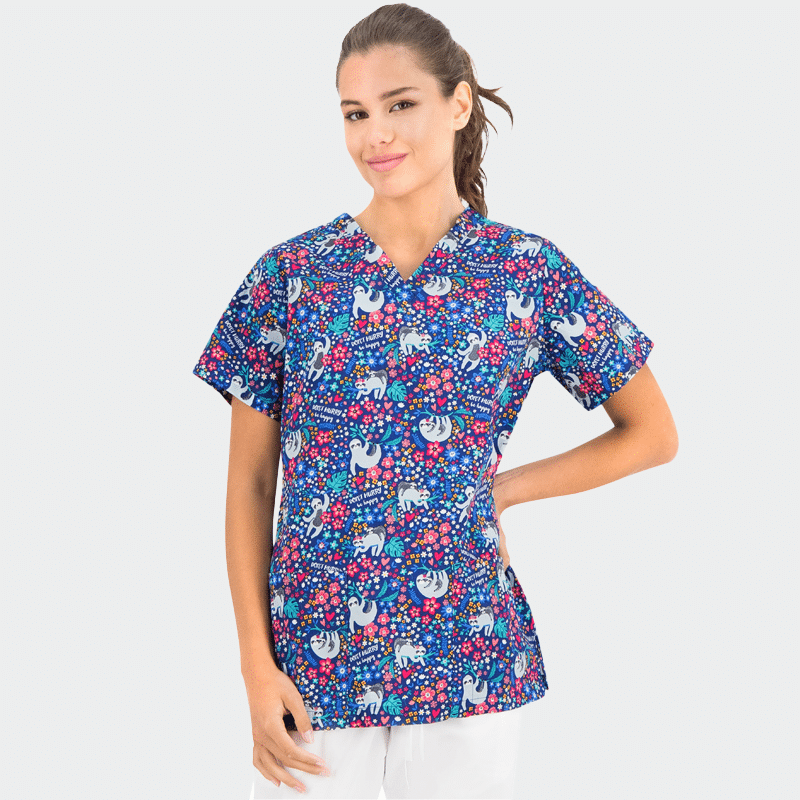 Ιατρική μπλούζα (Scrub top) BAMBINA της B-well με χαρούμενα σχέδια. Τύπωμα Sloths. 3D Flex και CL 40°C τεχνολογία. Με 2 τσέπες και V-λαιμόκοψη. Ιδανική για παιδιατρικά & κτηνιατρικά κέντρα.