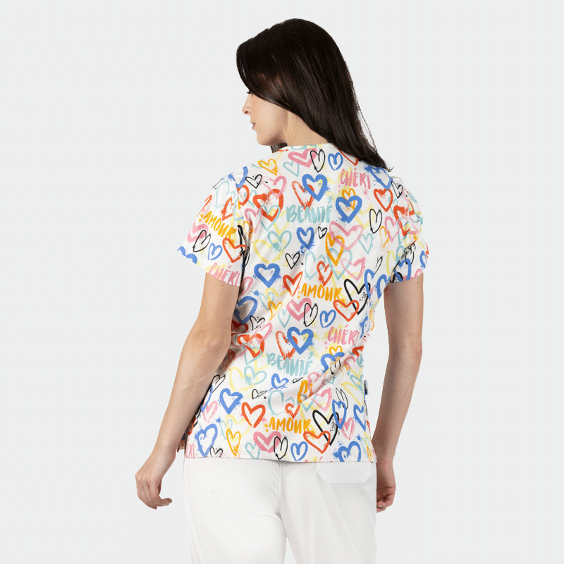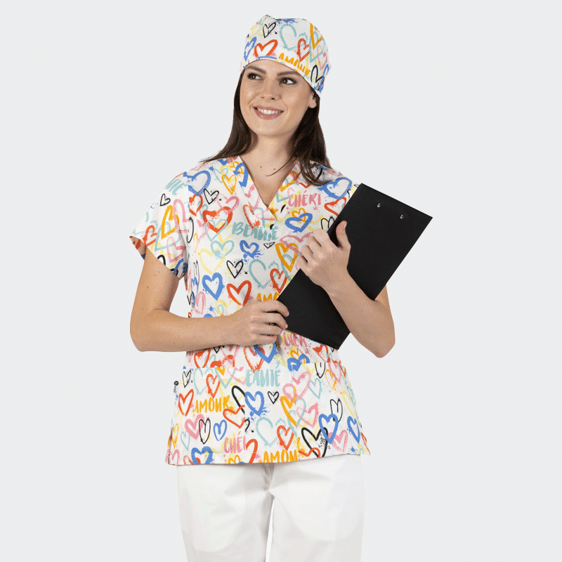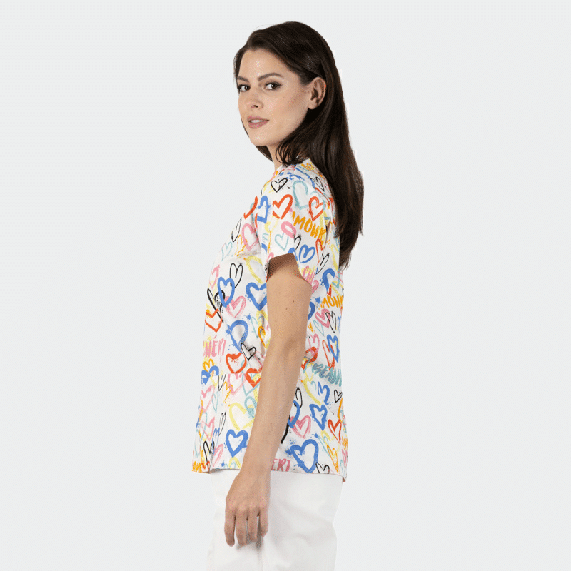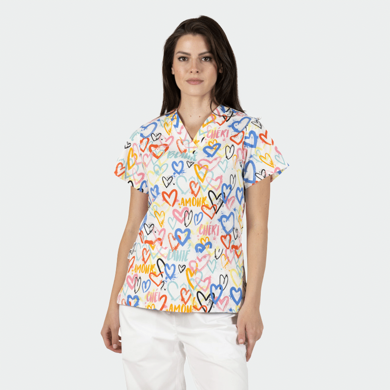 Ιατρική μπλούζα (Scrub top) BAMBINA της B-well με χαρούμενα σχέδια. Τύπωμα Hearts. 3D Flex και CL 40°C τεχνολογία. Με 2 τσέπες και V-λαιμόκοψη. Ιδανική για παιδιατρικά & κτηνιατρικά κέντρα.