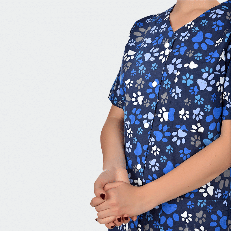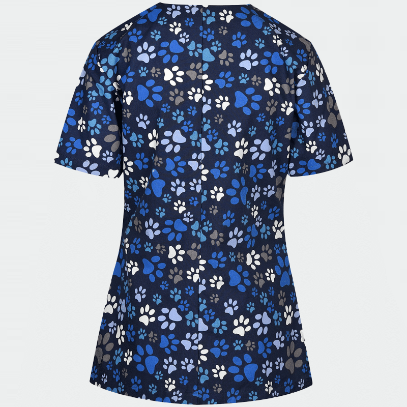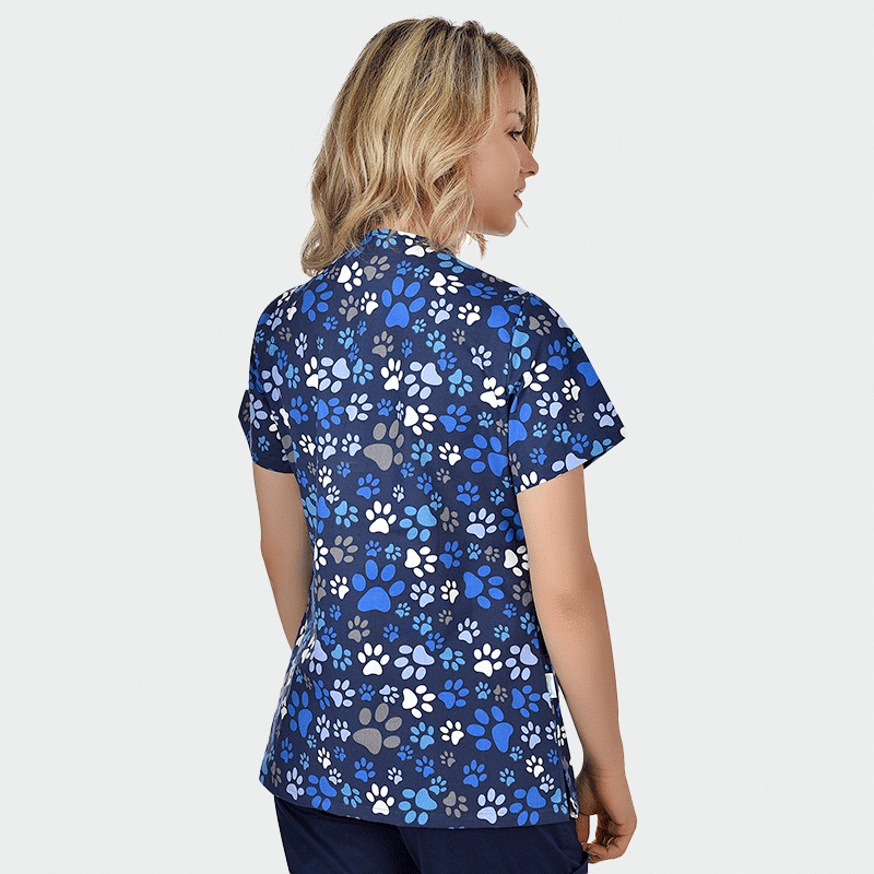 Γυναικεία Ιατρική μπλούζα (Scrub top) CARINA της B-well. Τύπωμα Paws. Διαπνέον ύφασμα με 3D Flex και CL 40°C. Ιδανική για παιδιατρικά και οδοντιατρεία.