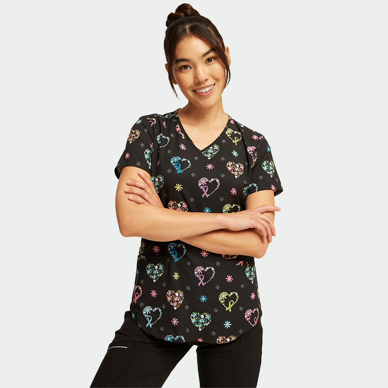 Γυναικεία ιατρική μπλούζα (Scrub top) GENUINE CK637 της CHEROKEE. Τύπωμα Care Flor-All. Εφαρμοστή γραμμή, V-λαιμόκοψη, με 2 τσέπες.