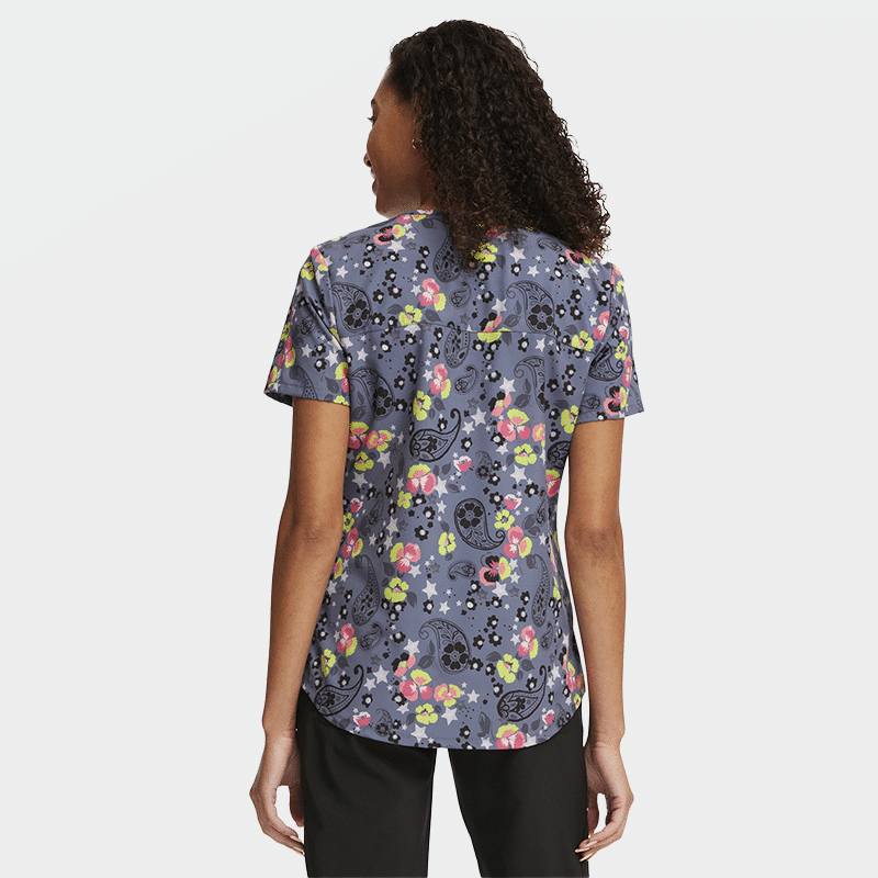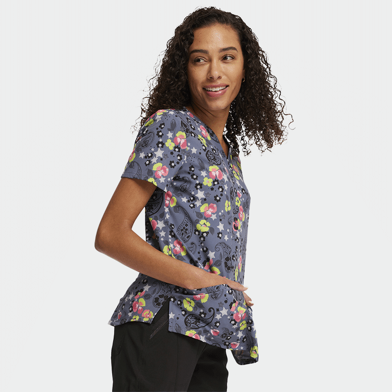 Η ιατρική μπλούζα GENUINE CK662 είναι μια κομψή γυναικεία scrub μπλούζα της CHEROKEE με εφαρμοστή σιλουέτα, V-λαιμόκοψη και μοντέρνο εμπριμέ σχέδιο. Είναι κατασκευασμένη από 91% πολυεστέρα και 9% ελαστάνη – 175 g/m², που προσφέρει άνεση, ευελιξία και αντοχή.