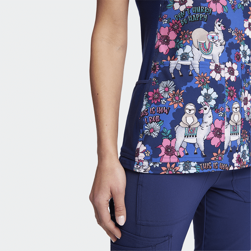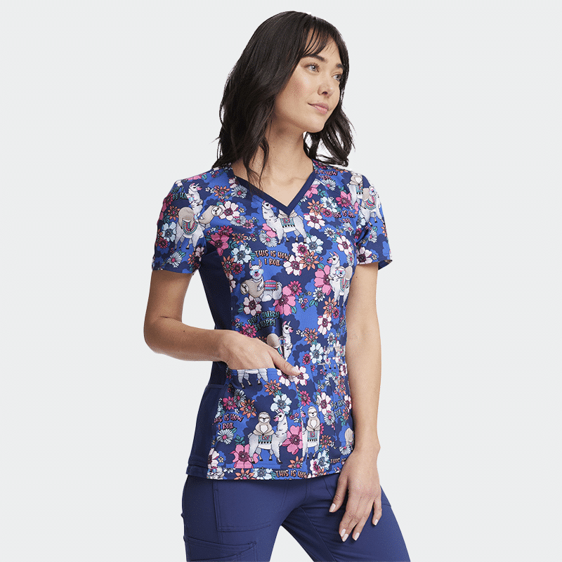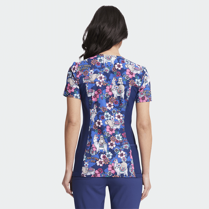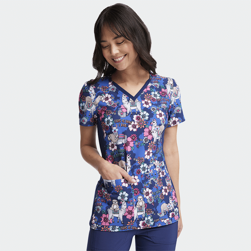 Γυναικεία ιατρική μπλούζα (Scrub top) IFLEX CK636 της Cherokee. Τύπωμα Happy Pals. V-λαιμόκοψη, διαπνέον πλαϊνό ύφασμα, 4 τσέπες για ψαλίδι & κινητό.