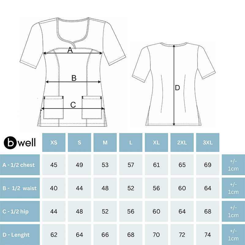 Η ιατρική μπλούζα INES είναι μια κομψή και εφαρμοστή ιατρική μπλούζα εργασίας της μάρκας B-well, με εκφραστική λαιμόκοψη και σχεδιασμό που συνδυάζει άνεση με επαγγελματική εμφάνιση. Ενσωματώνει τεχνολογία CL 40°C για διατήρηση του χρώματος, τόσο σε πλύσιμο στο χέρι όσο και στο πλυντήριο.