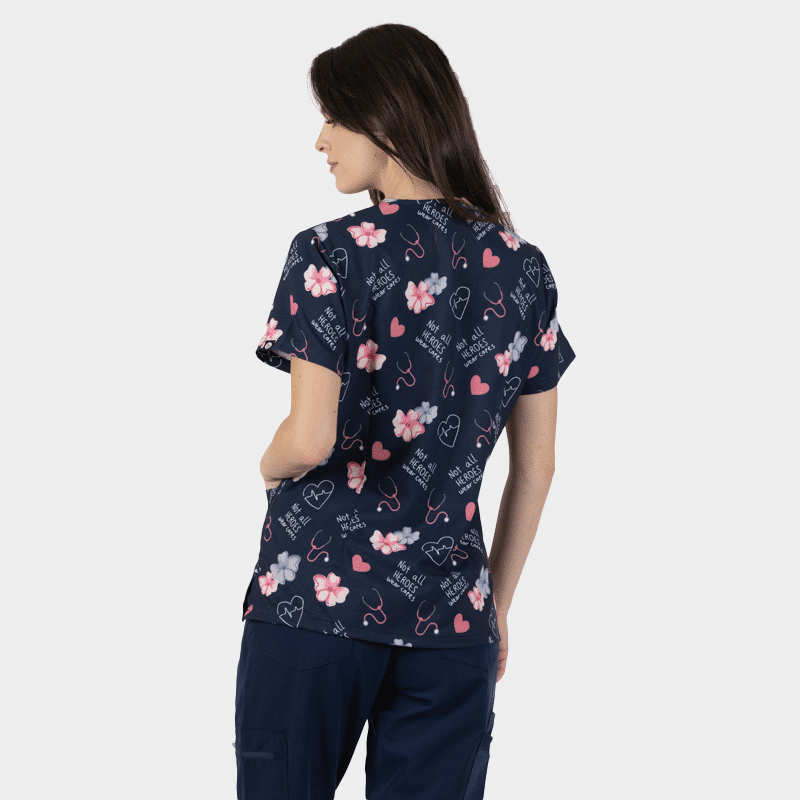 Γυναικεία ιατρική μπλούζα ISABELLA της Bwell. Τύπωμα Heroes. Με V λαιμόκοψη, πλαϊνά ανοίγματα & τσέπες. Ανάλαφρη και άνετη για επαγγελματίες υγείας και αισθητικής.