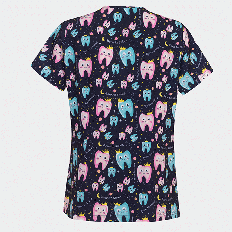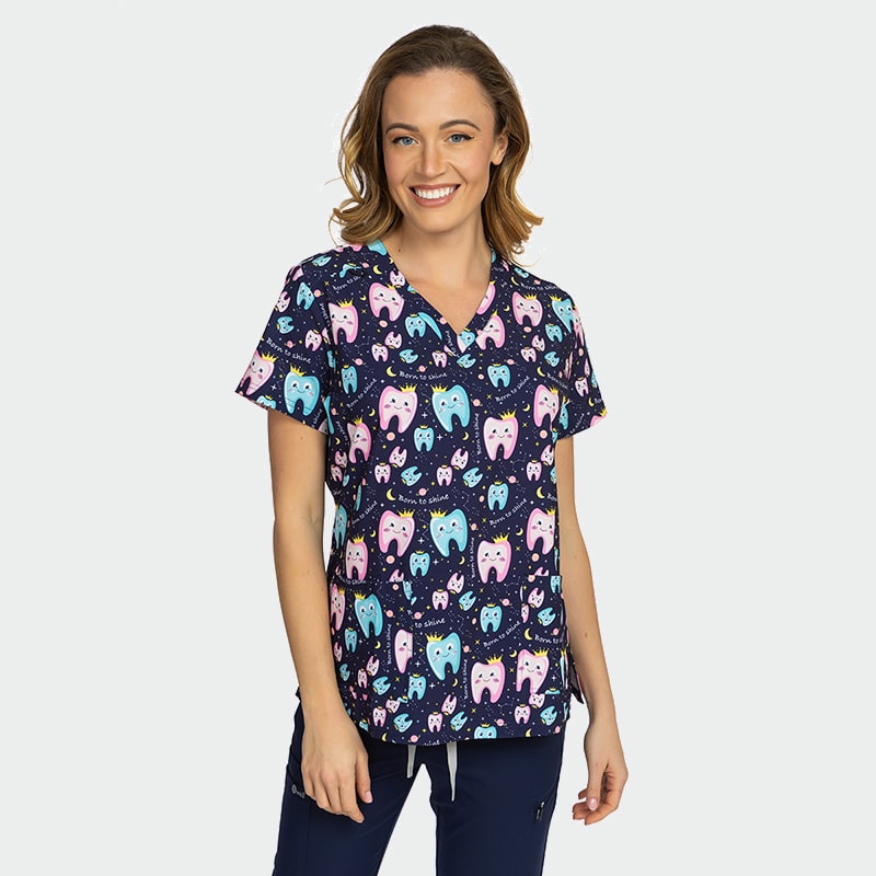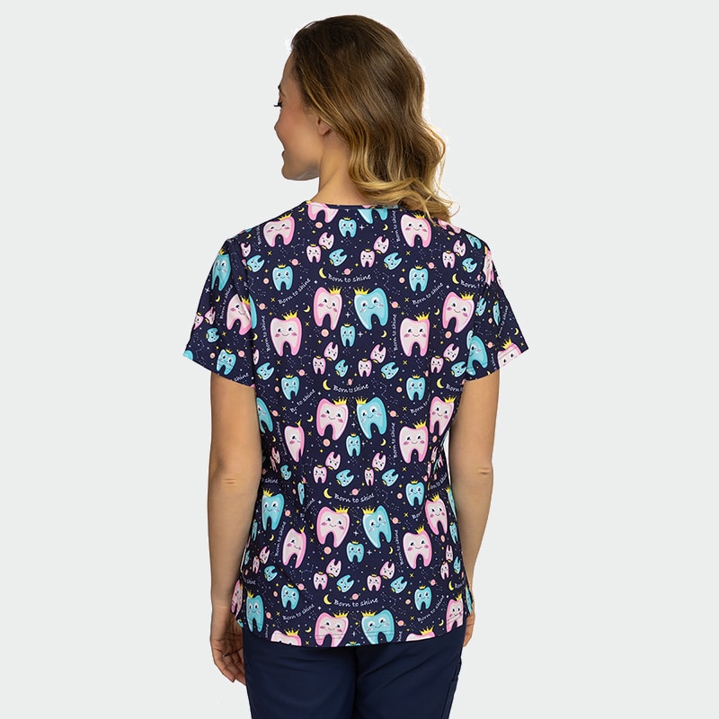 Γυναικεία ιατρική μπλούζα ISABELLA της Bwell. Τύπωμα Born to Shine. Με V λαιμόκοψη, πλαϊνά ανοίγματα & τσέπες. Ανάλαφρη και άνετη για επαγγελματίες υγείας και αισθητικής.