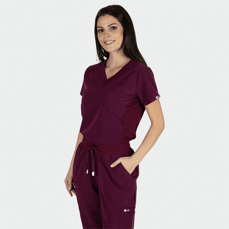 Γυναικεία ιατρική μπλούζα JULIA της Bwell. Χρώμα Μπορντό. Με V λαιμόκοψη, τσέπες με χωρίσματα και θηλάκι για κονκάρδα. Άνετη, κομψή & πρακτική για επαγγελματίες υγείας.