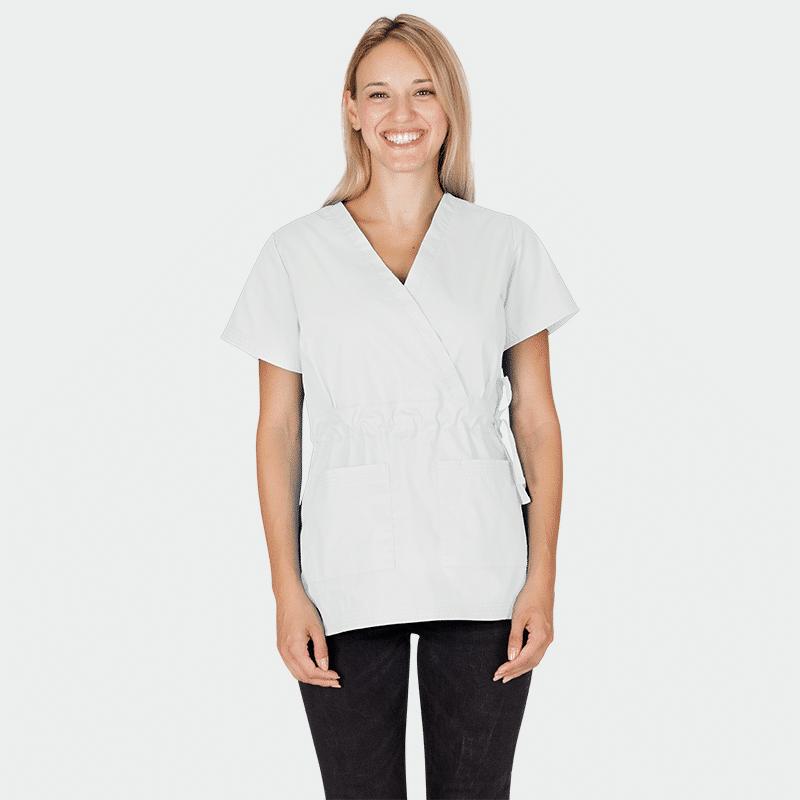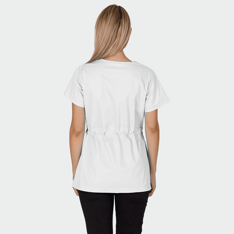 Γυναικεία ιατρική μπλούζα LAURA της Bwell. Χρώμα Λευκό. Με ζώνη μέσης, τσέπες & τεχνολογία 3D Flex. Ανθεκτική, άνετη & κομψή για επαγγελματίες υγείας.