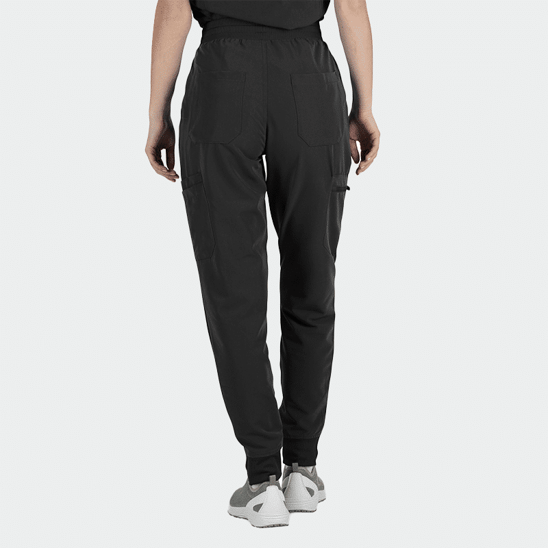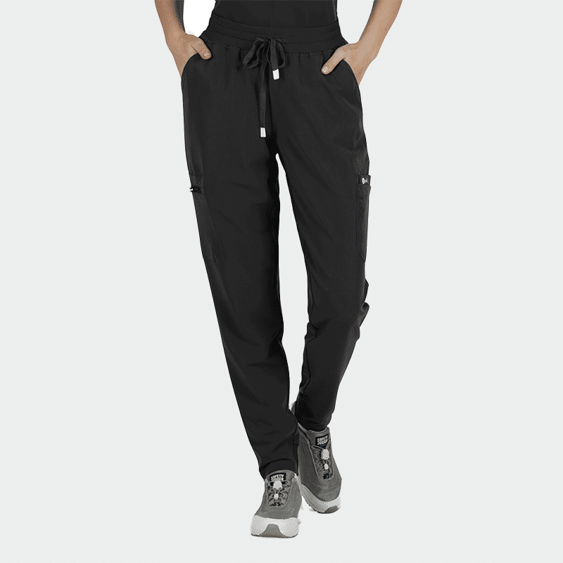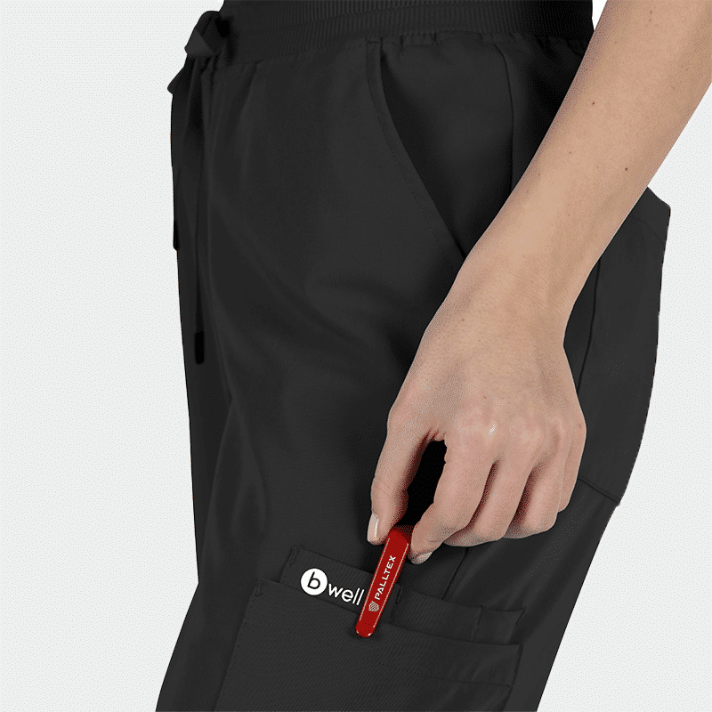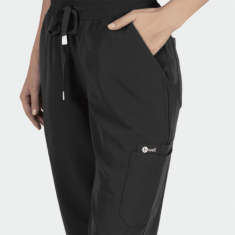 Γυναικείο ιατρικό παντελόνι (Scrub trousers) MAURI της Bwell. Χρώμα Μαύρο. Με φαρδιά ελαστική μέση, πολλές τσέπες και διαπνέον ύφασμα. Κομψό, άνετο και ιδανικό για επαγγελματίες υγείας.