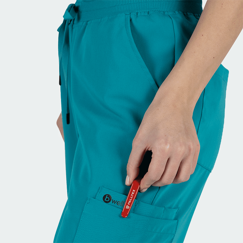 Γυναικείο ιατρικό παντελόνι (Scrub trousers) MAURI της Bwell. Χρώμα Πετρόλ. Με φαρδιά ελαστική μέση, πολλές τσέπες και διαπνέον ύφασμα. Κομψό, άνετο και ιδανικό για επαγγελματίες υγείας.