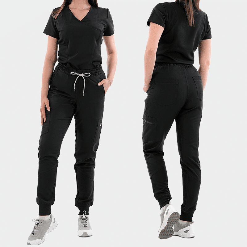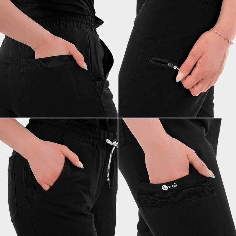 Γυναικείο ιατρικό παντελόνι (Scrub trousers) Bwell RICCI. Χρώμα Μαύρο. Με σπορ κομψή γραμμή, 7 τσέπες και ελαστική μέση. Από διαπνέον ύφασμα για άνεση και σιγουριά όλη μέρα.
