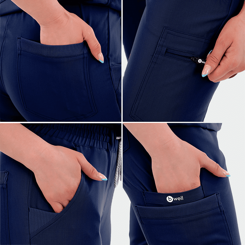 Γυναικείο ιατρικό παντελόνι (Scrub trousers) Bwell RICCI. Χρώμα Μπλε σκούρο. Με σπορ κομψή γραμμή, 7 τσέπες και ελαστική μέση. Από διαπνέον ύφασμα για άνεση και σιγουριά όλη μέρα.